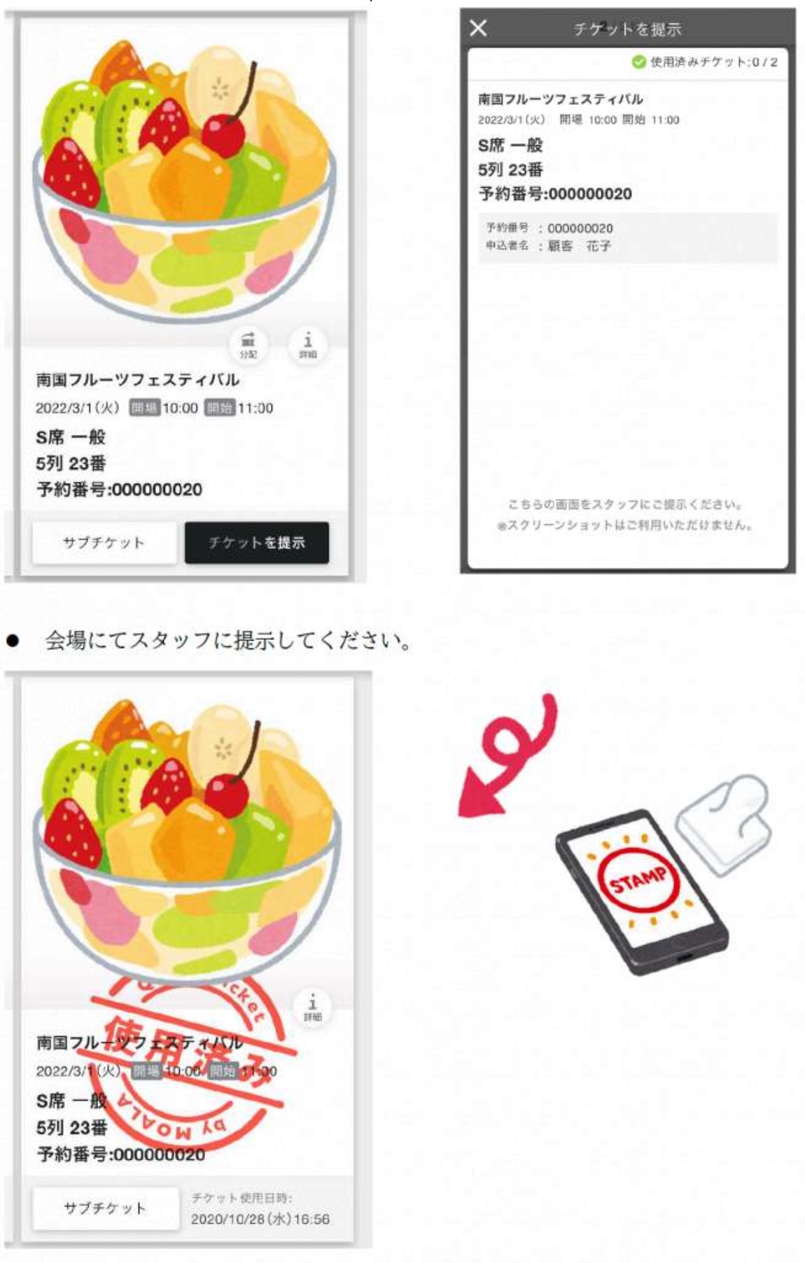 いつでも発券で使う電子チケットでは、『もぎり』に相当する『電子スタンプ』で入場(使用済)ステータスを管理します。